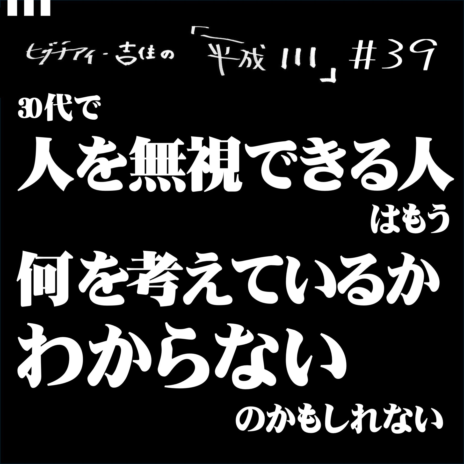 今回の「111」(=日々生きていく中で心に浮かんだ名もなき感情)は、 『30代で人を無視できる人はもう何を考えているかわからないのかもしれない』です。 36歳3か月の2人が生きる記録、39回目です。 平成元年11月生まれ。 いつもは1人で活動している同い年のヒグチアイと吉住が、 1日1日生きていく中で心に浮かんだ「まだ曲にもコントにもなってない」感情を、 ”いちいち言わなくていいけど…”言葉にしてみるPodcast。 毎週金曜日夕方6時頃配信予定。 番組公式フォームでは、皆さんからも「111」を募集中です。 ご感想は「#平成111」でXなどに投稿いただけると嬉しいです。 番組の取扱説明は…