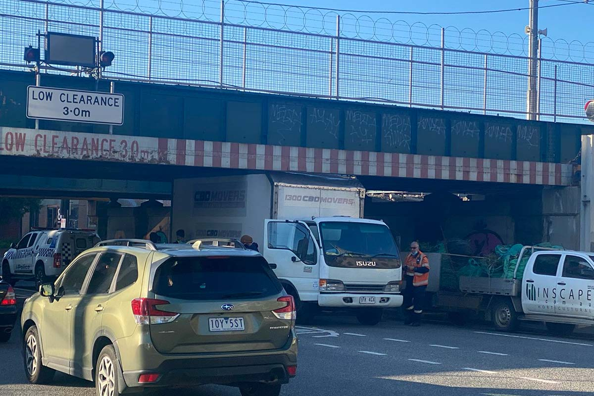 A truck is stuck under the Montague Street Bridge