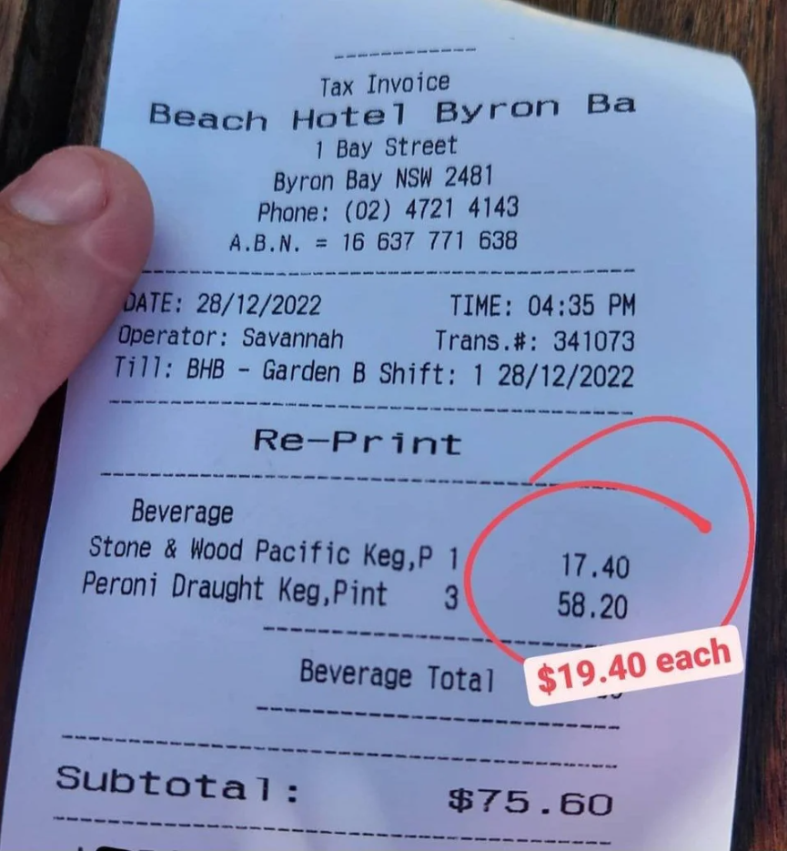 The eyewatering price for a pint of beer at a Byron pub
