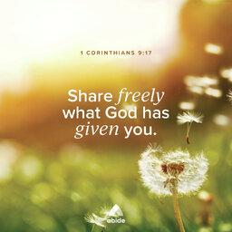 Wherever you are today, this biblical meditation, narrated by Tyler Boss, offers a quiet space to pause and reconnect with God. What do you need to give away? Meditate on 1 Corinthians 9:17. Abide is a Christian meditation app that helps you experience peace and grow in your relationship with Chr…