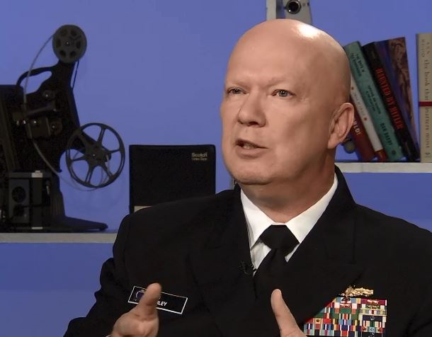 Rear Adm. Jeffrey A. Harley, president of the Naval War College, in the studios of R.I. PBS