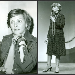Gloria Valencia de Castaño, en octubre de 1957, durante las 'Bodas de Oro' de la empresa Coltejer, entrevista a varios de las asistentes al evento.