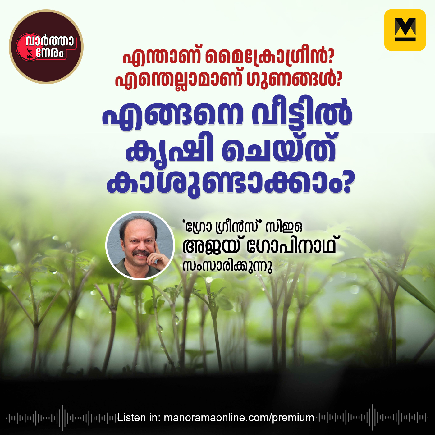 മലയാളികളുടെ ഭക്ഷണ ചർച്ചകളിൽ ഇപ്പോൾ ഏറ്റവും കൂടുതൽ ആഘോഷിക്കപ്പെടുന്ന ആഹാരമാണ് മൈക്രോഗ്രീൻ. എന്താണ് മൈക്രോഗ്രീൻ? എന്തൊക്കെയാണ് അതിന്റെ ഗുണങ്ങൾ? എങ്ങനെ വീട്ടിൽ കൃഷിചെയ്യാം? മനോരമ ഓൺലൈൻ പ്രീമിയം വെബിനാറിൽ വിശദമായി സംസാരിക്കുകയാണ് ‘ഗ്രോ ഗ്രീൻസ്’ സിഇഒ അജയ് ഗോപിനാഥ്. Microgreens have become the latest se…