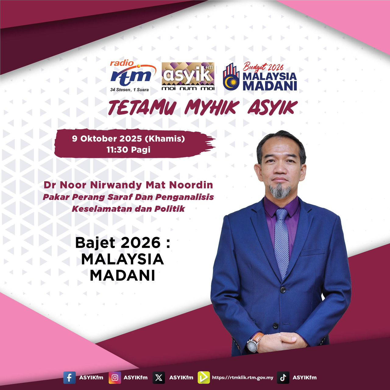 Dengarkan temubual khas di Radio ASYIKfm dalam Segmen Myhik ASYIK bersama Dr Noor Nirwandy Mat Noordin, Pakar Perang Saraf dan Penganalisis Keselamatan dan Politik yang akan berkongsikan topik mengenai Bajet 2026 : MALAYSIA MADANI TARIKH : 9 Oktober 2025 (Khamis) MASA : 11:30 Pagi Saksikan juga โฆ