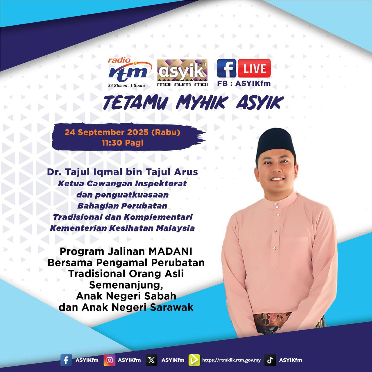 Dengarkan temubual khas di Radio ASYIKfm dalam Segmen Myhik ASYIK bersama Dr. Tajul Iqmal bin Tajul Arus, Ketua Cawangan Inspektorat dan penguatkuasaan. Bahagian Perubatan Tradisional dan Komplementari Kementerian Kesihatan Malaysia mengenai Program Jalinan MADANI Bersama Pengamal Perubatan Tradisiโฆ