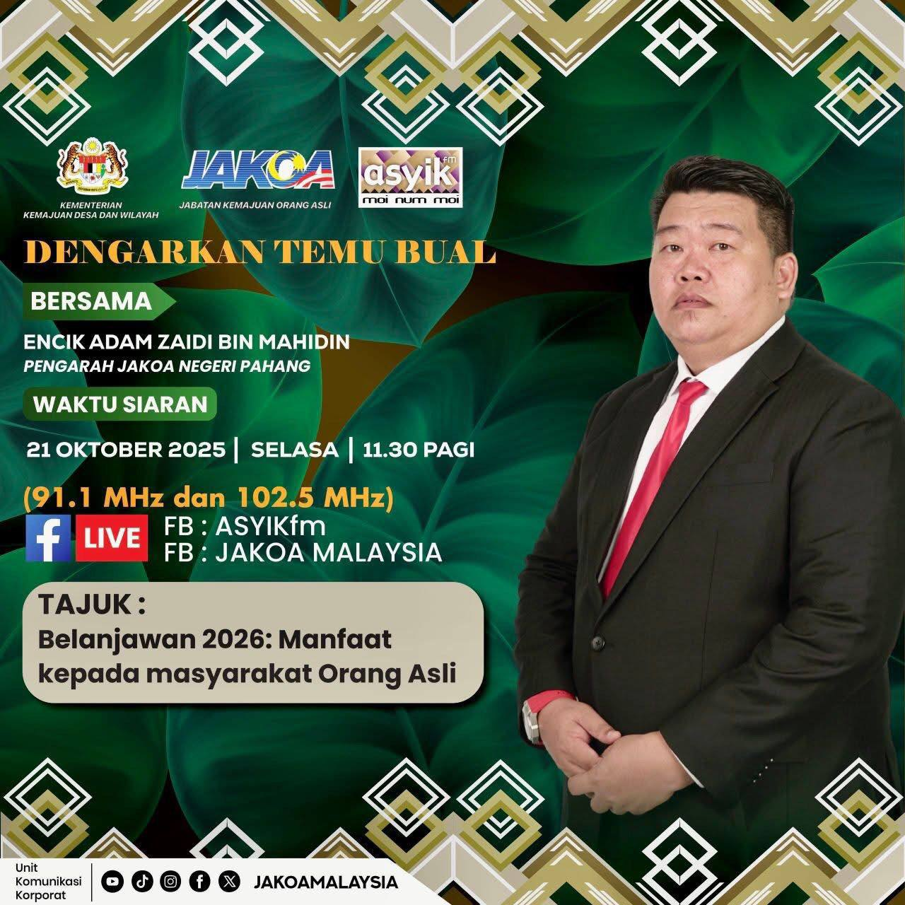 Dengarkan temu bual bersama Encik Adam Zaidi bin Mahidin, Pengarah JAKOA Negeri Pahang dalam radio ASYIKfm ๐ Tarikh: 21 Oktober 2025 (Selasa) ๐ Masa: 11.30 pagi ๐ Topik: Belanjawan 2026: Manfaat kepada masyarakat Orang Asli ๐ Frekuensi: 91.1 atau 102.5 MHz Podcast disunting oleh: Muhiri Siwasโฆ