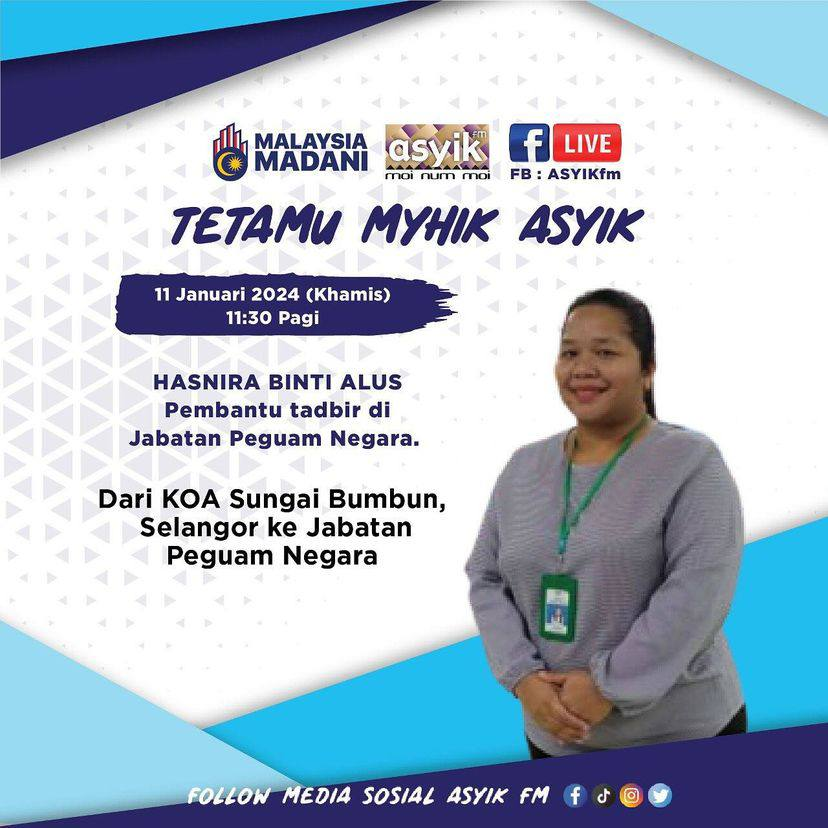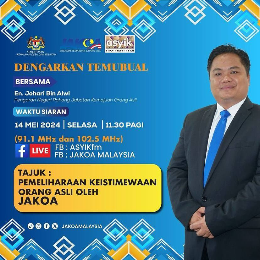 Myhik ASYIK : Dasar Pembangunan Orang Asli (DPOA)Dengarkan temubual khas Puan Norlaila Binti Jaafar, Penolong Pengarah Kanan, Bahagian Perancangan & Penyelidikan, JAKOA dan Puan Eira Khanum, Koordinator Projek - Dasar Pembangunan Orang Asli (DPOA), United Nations Development Programe (UNDP) Malaysia, Singapore & Brunei Darussalam yang akan berkongsikan topik mengenai Dasar Pembangunan Orang Asli (DPOA)