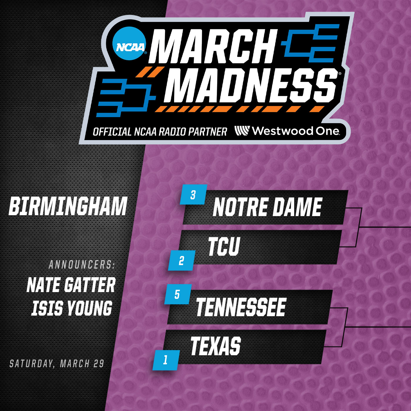 Nate Gatter and Isis Young called the action on Westwood One from Birmingham.