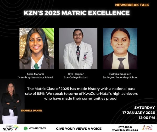 By Newsbreak's Shanell Daniel Despite many challenges the Matric Class of 2025 has bagged a historic national pass rate of 88% – making it the highest in the country's history. But, how did they do it? Top achievers, Yudhika Pragalath, Alicia Maharaj and Diya Hargoon provide insight into how they …