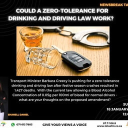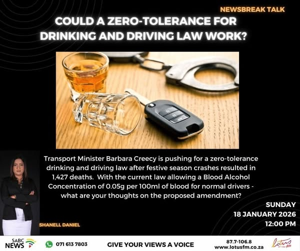 By Newsbreak's Shanell Daniel Transport Minister Barbara Creecy is pushing for a zero-tolerance drinking and driving law proposed through the National Road Traffic Amendment Bill. This after analysis has proven that drinking and driving largely contributes to road fatalities in the country. Therap…