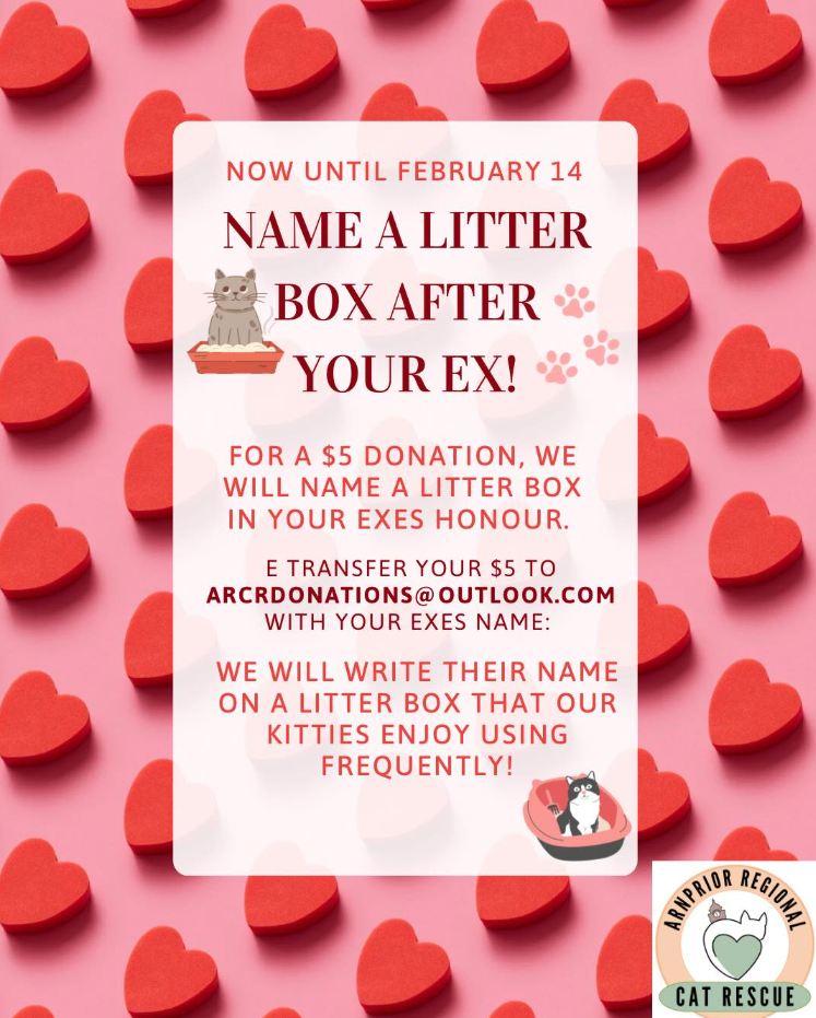 We LOVE this! Just in time for Valentine's Day, the Arnprior Regional Cat Rescue wants to help you get back at your ex! For a minimum $5 per entry, your ex's name will be written on a litter box that their kitties frequently use! Send your exes name in the comments of your transfer to:arcrdonati…