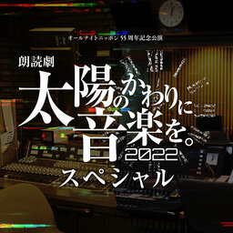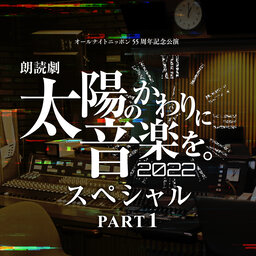 朗読劇「太陽のかわりに音楽を。2022」の上演を記念したスペシャル番組。 出演は、伊東健人、酒巻光宏、田中美海、西山宏太朗の4名。 Part1では、「ラジオの面白さ」をテーマにしたトークや、 作品中の名シーンの再現をお送りします。 さらに、オープニングとエンディングには、 ディレクター役としても参加しているあの人が登場! 公演を楽しむための必聴プログラム、おききのがしなく! 朗読劇「太陽のかわりに音楽を。2022」公式HP http://rouacastage.com/ 番組の感想は、 sun@allnightnippon.com まで!