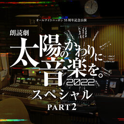 朗読劇「太陽のかわりに音楽を。2022」の上演を記念したスペシャル番組。 出演は、伊東健人、酒巻光宏、田中美海、西山宏太朗の4名。 Part2では、「ラジオでの失敗」をテーマにしたトークや、 作品中の名シーンの再現をお送りします。 さらに、オープニングとエンディングには、 ディレクター役としても参加しているあの人が登場! 公演を楽しむための必聴プログラム、おききのがしなく! 朗読劇「太陽のかわりに音楽を。2022」公式HP http://rouacastage.com/ 番組の感想は、 sun@allnightnippon.com まで!