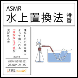 「水上置換法」。 むかし学校で習った気がする懐かしい響きの言葉ですが、「それって何だっけ?」という思う方も少なくないかもしれません。 「水上置換法」とは、実験によって発生した気体を集める方法の1つです。 水で満たした容器を水の中で下に向け、その容器の中に発生した気体を集めることで、空気と混ざらずに純粋な目的の気体を得ることができます。 主に水に溶けにくい気体を集める際に用いられます。 今回は、二酸化マンガンに過酸化水素水を加え、酸素を発生させます。そして、その発生した酸素が水上置換法によって水面から出てくる時の泡の音をお聴きいただきます。このASMR特番で泡の音をお届けするにあたり、機械で泡…