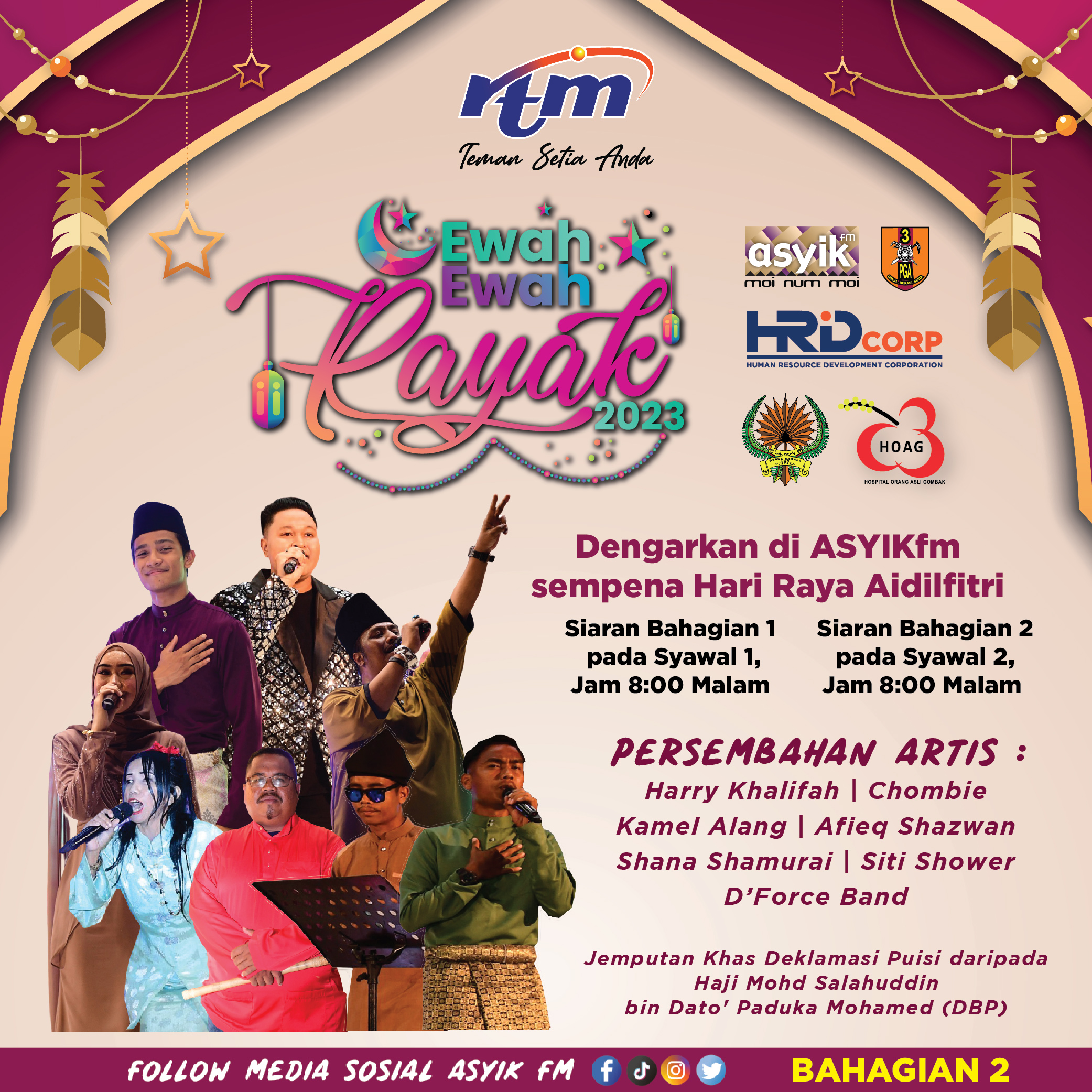 Ewah-Ewah Rayak 2023ย oleh ASYIKfm yang diadakan di Dataran Pentas Hormat, Kem PGA Batalion 3, Bidor, Perak. Dengarkan rakaman untuk BAHAGIAN 2 Persembahan artis : Harry Khalifah Chombie Kamel Alang Afieq Shazwan Shana Sahmurai Siti Shower D'Force Band *Jemputan khas deklamasi puisi daripada Hajiโฆ