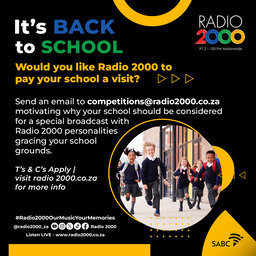 It's back to school... Would you like Radio 2000 to pay your school a visit? Send an email to competitions@radio2000.co.zamotivating why your school should be considered for a special broadcast with Radio 2000 personalities gracing your school grounds. T’s & C’s Apply | visit radio 2000.co.za …