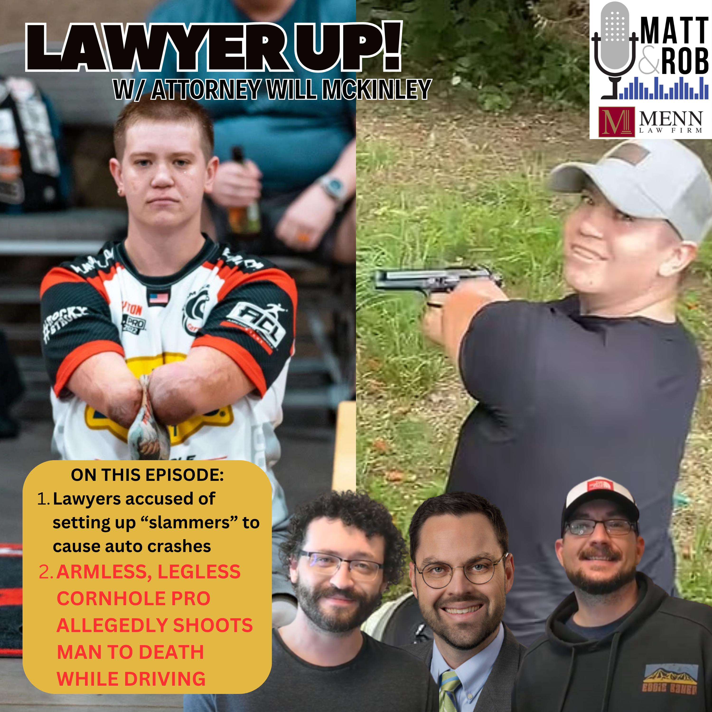 ON THIS EPISODE: Lawyers accused of setting up “slammers” to cause auto crashes ARMLESS, LEGLESS CORNHOLE PRO ALLEGEDLY SHOOTS MAN TO DEATH WHILE DRIVING
