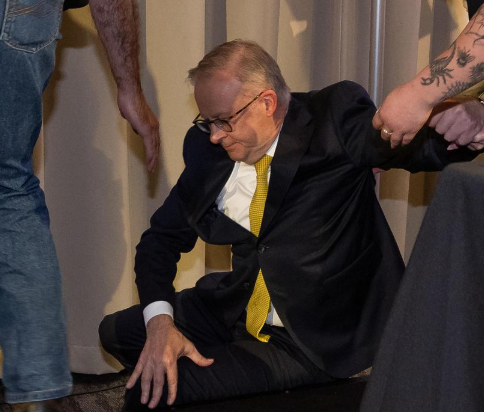 Campaign stumble: Albanese trips off stage, laughs it off