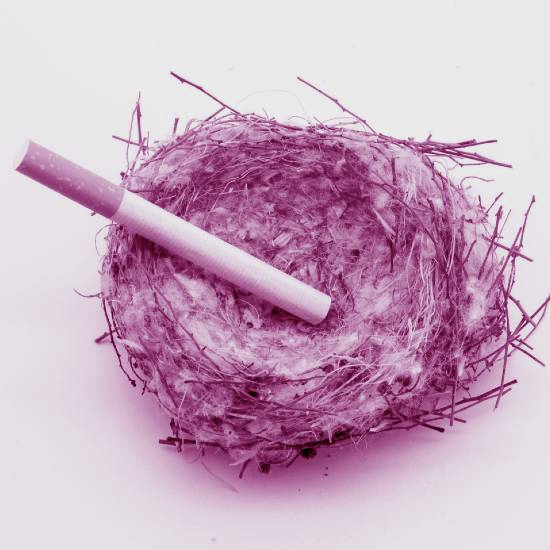 קן לציפור בין העצים ובקן לה שלושה סיגרים