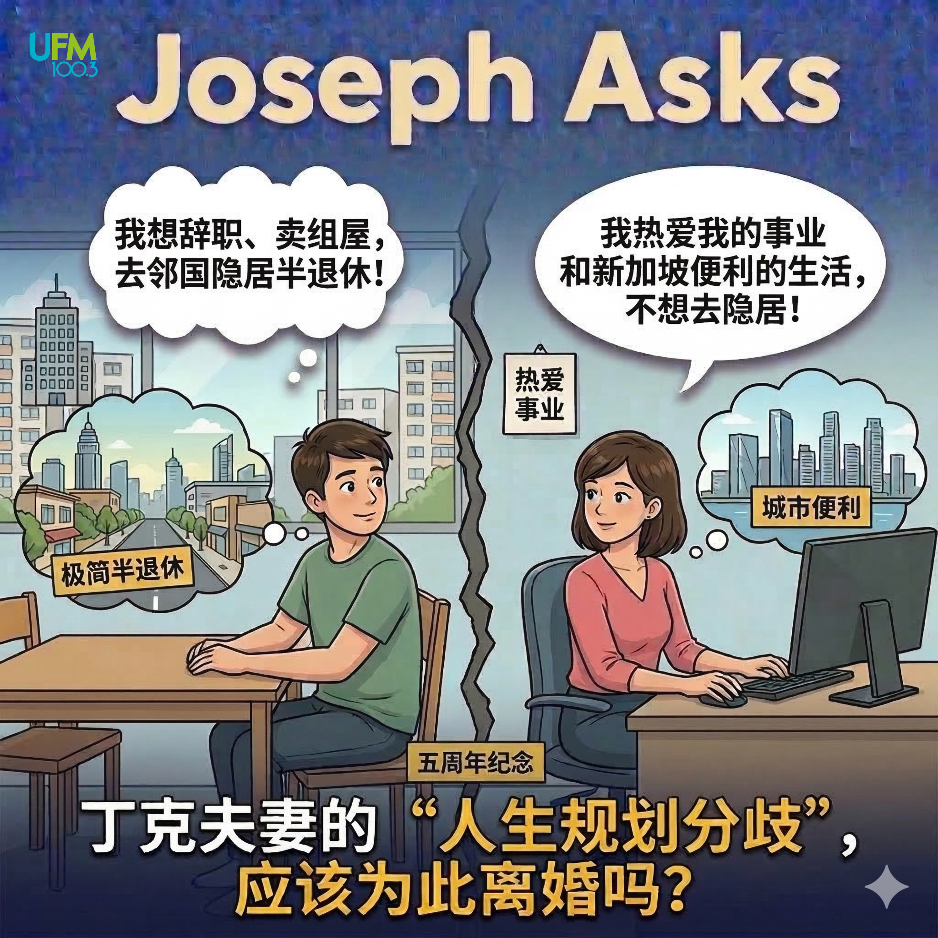 【本集探讨亮点 / The Core】 寻找“中间值”的缓冲方案:人生不是非黑即白,没必要立刻卖房移民或离婚。节目中提出了多种折中方案:例如先在当地租房试住一两年、把它当成周末放松的度假屋,或者两人尝试短暂的“双城生活”——老公在异国休养,老婆继续留在新加坡工作。 是真想“隐居”,还是职场倦怠的“求救信号”?:有听众敏锐指出,老公可能并非真的向往田园生活,而是被高压工作压得喘不过气,发出了心理状态上的“求救信号”。他真正需要的可能只是一个情绪出口、一个长假或是转换职业跑道重新寻找人生目标,这甚至在新加坡本地就可以完成调整。 都市生活 vs 田园牧歌,没有高下之分:有些人向往宁静的乡村,有些人…