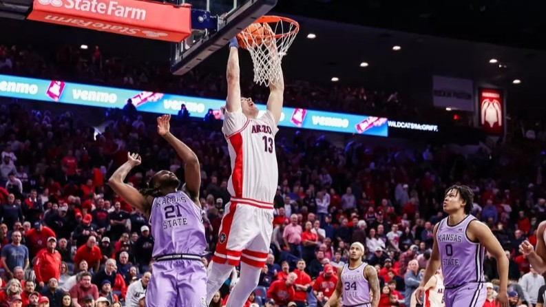 D.K. on the Sports Tip 3 p.m. hour (1-8-26): Tommy Lloyd and his Arizona Wildcats made a conscious effort to get Motiejus Krivas involved at the offensive end of the floor in their win over Kansas State and that is something that needs to happen more often. (Photo courtesy: Arizona Athletics)