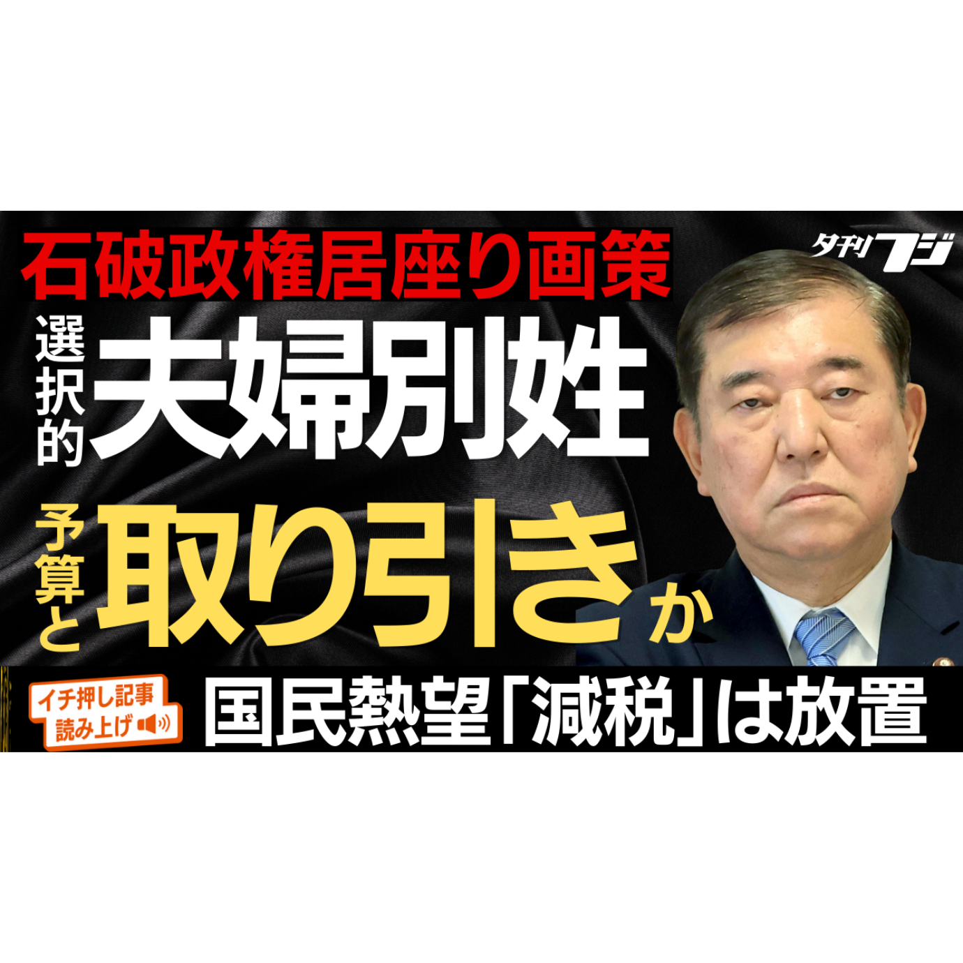 「夕刊フジ」(産経新聞社発行)は1月31日をもって休刊します。特別保存版「さらば、オレンジ色のニクい奴」を緊急発売。詳しくはこちら(リンク) 選択的夫婦別姓に関する石破茂首相の言動が注目されています。自民党内が推進派と反対派で割れるなか、ネット番組で折衷案に言及した一方、27日の衆院本会議では「いつまでも結論を先延ばししてよい問題とは考えていない」と語り、党内の意見を集約するワーキングチームの幹事長と事務局長に推進派を送り込みました。立憲民主党との「部分連合」を見据えて、「党議拘束を外すのでは」との疑念も消えません。党内では「首相は延命のためには何をするか分からない」との警戒感も広がってい…
